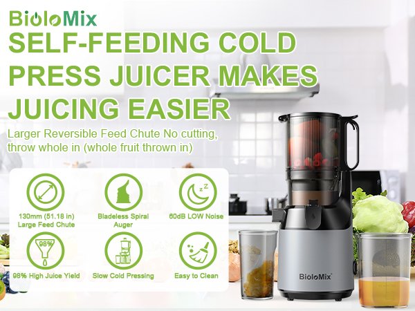 BioloMix Cold Press Juicer with 78mm Feed Chute, 200W 40-65RPM Powerful Motor
